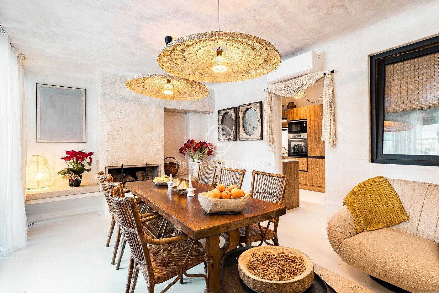 Gracias a su doble orientación, la vivienda disfruta de abundante luz natural y ventilación cruzada. El salón, acogedor y elegante, cuenta con chimenea y acceso tanto a una agradable terraza a nivel como a una espectacular terraza superior de unos 25 m², a la que se accede mediante escalera de caracol. La cocina abierta, equipada con mobiliario y electrodomésticos de alta gama, se integra perfectamente en el espacio.