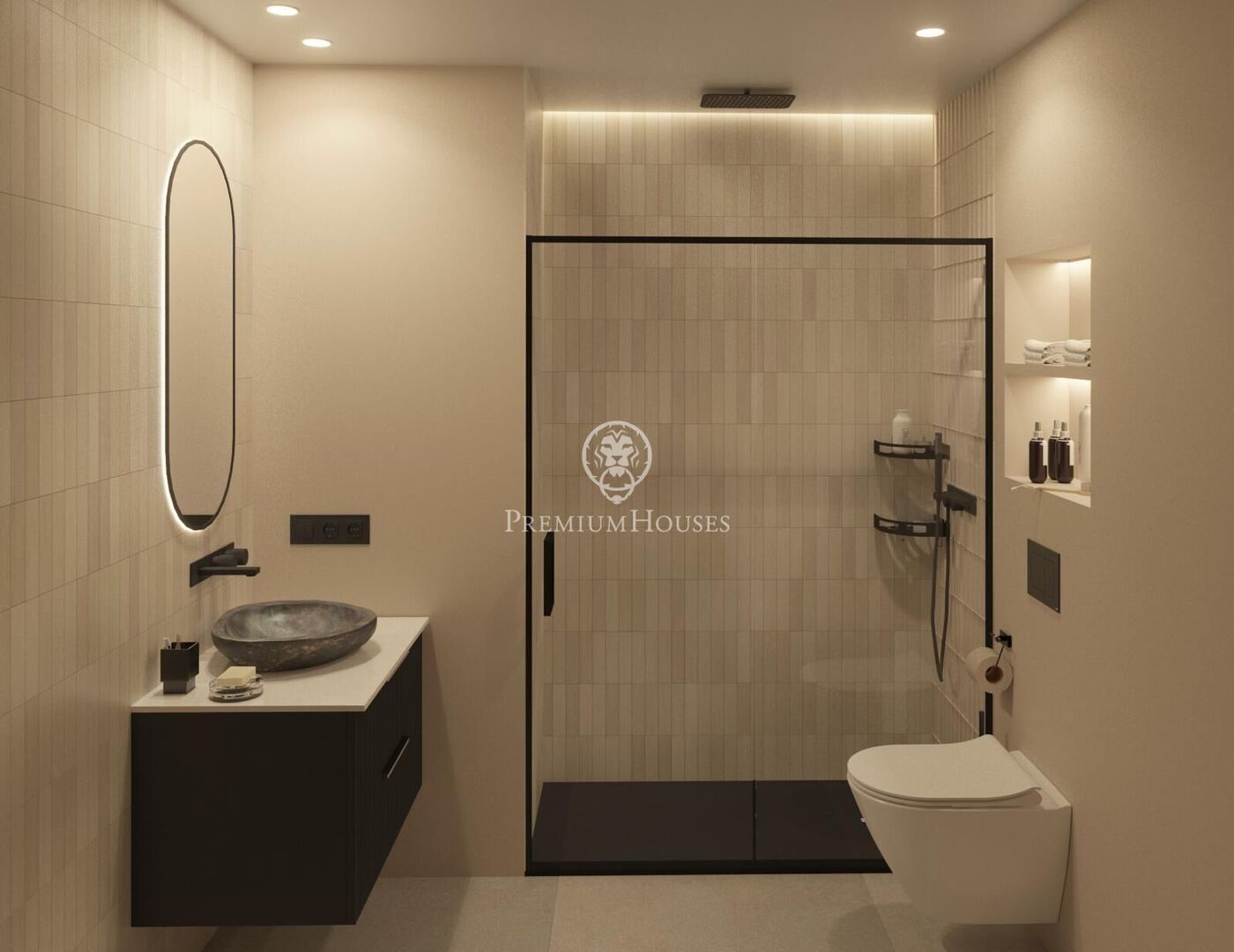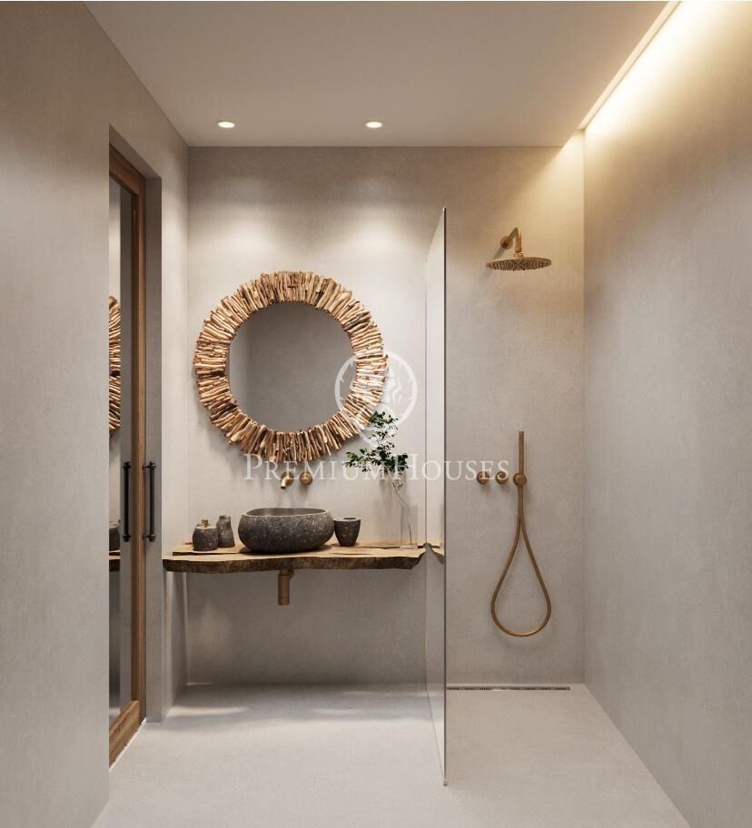 En la planta baja se encuentra un salón-comedor con cocina americana equipada y barra, paredes de obra vista y piedra de río, techos con volta catalana y un lucernario que aporta luz natural. Desde la otra entrada se accede a una habitación con bigas de madera y baño completo. La planta superior alberga un dormitorio principal, un baño y un vestidor.