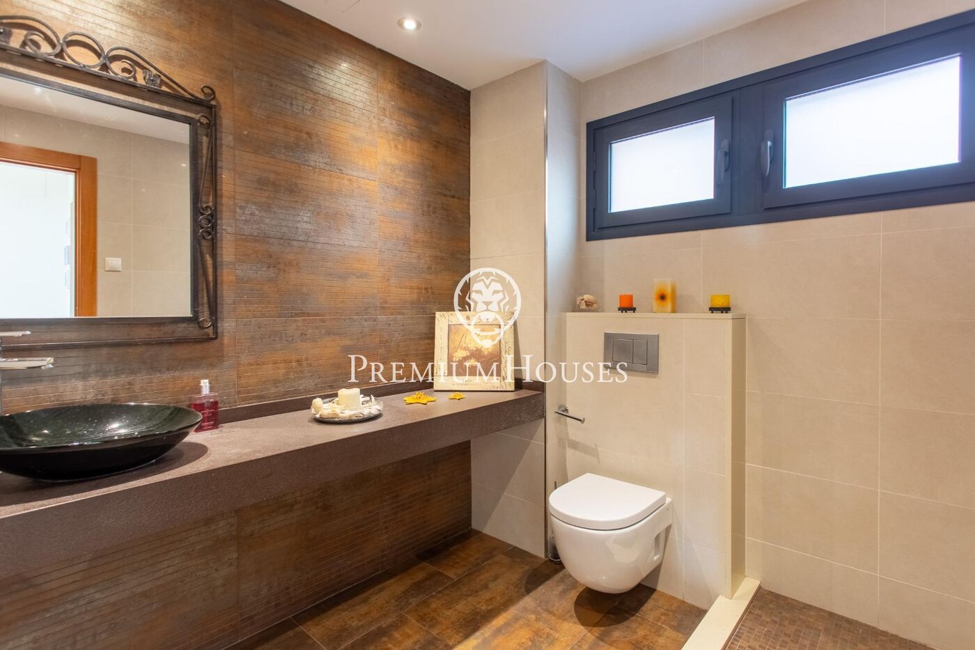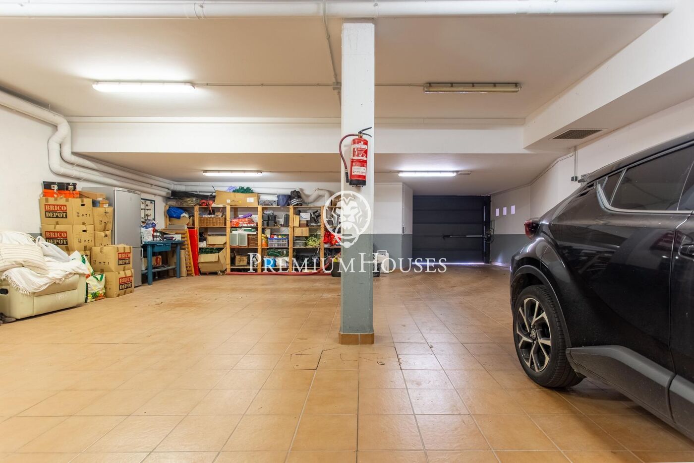 A la planta inferior hi ha una àmplia sala polivalent de 45 m², un lavabo de cortesia, la sala de màquines i el garatge, amb capacitat per a 4 cotxes.