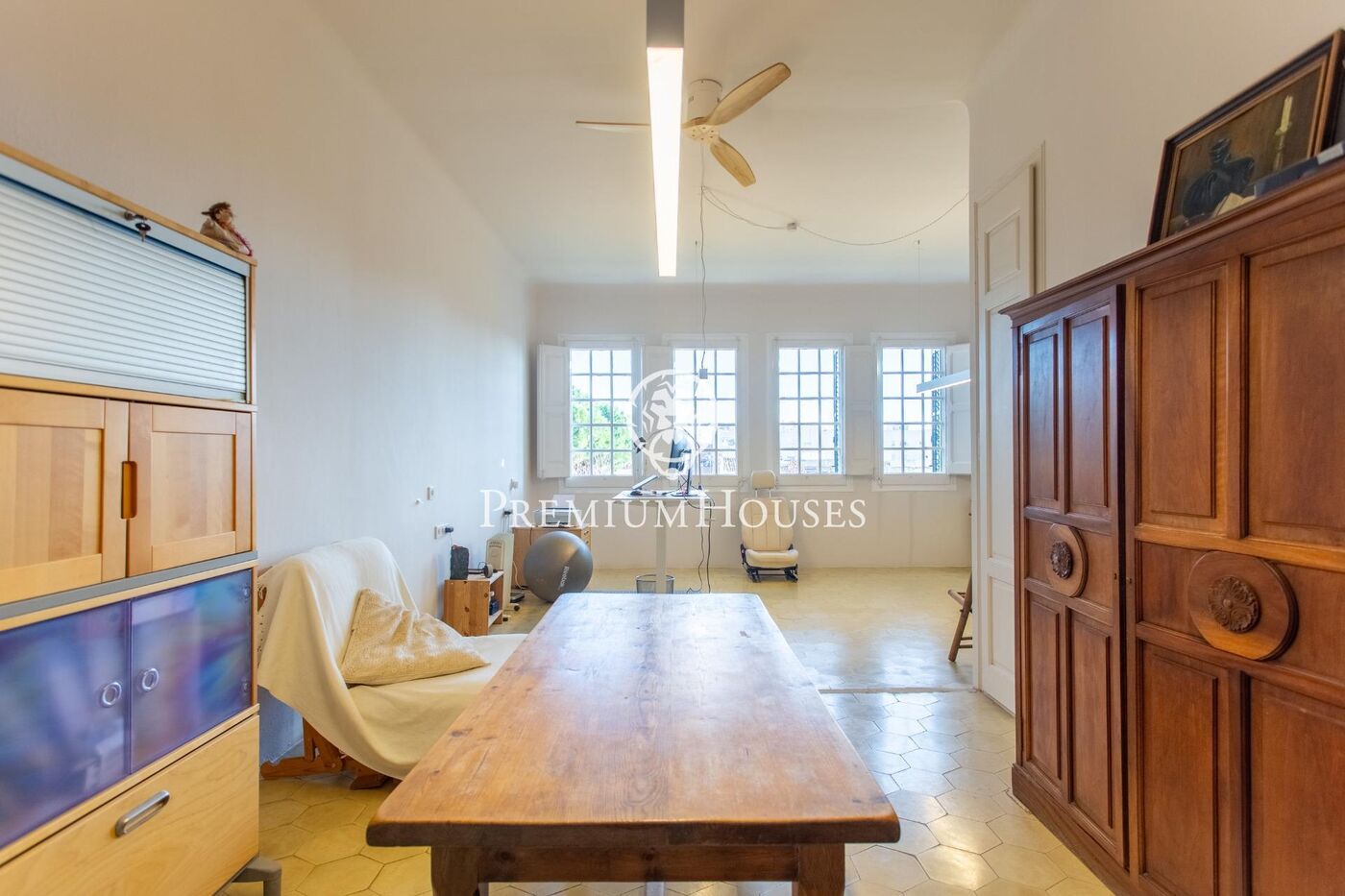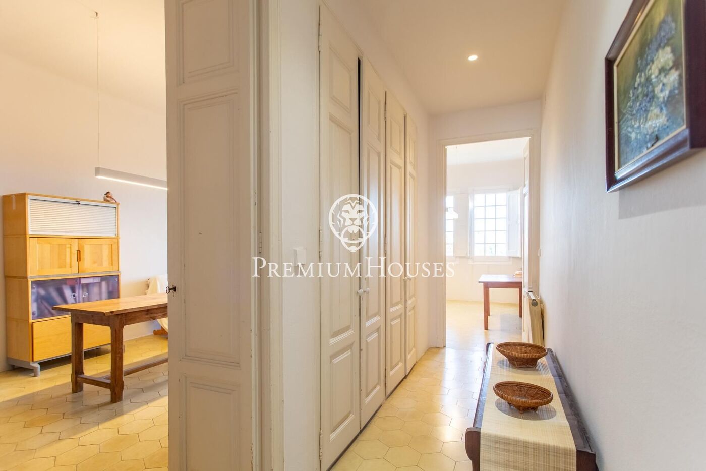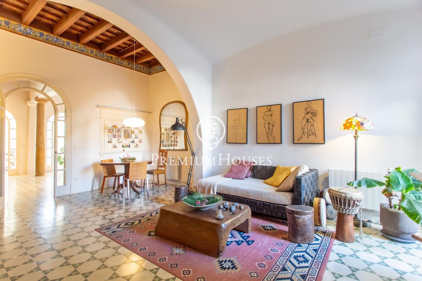 Des del vestíbul s'accedeix a una sala elegant amb tres grans finestrals que inunden l'espai de llum natural i ofereixen agradables vistes al jardí. L'ampli saló-menjador es distribueix en dos ambients perfectament diferenciats: el menjador, amb un extraordinari sostre enteixinat de fusta decorat amb ceràmica ornamental, i el saló, presidit per una delicada volta de mocador.Una porta de vidre de quarterons connecta directament el menjador amb el jardí.