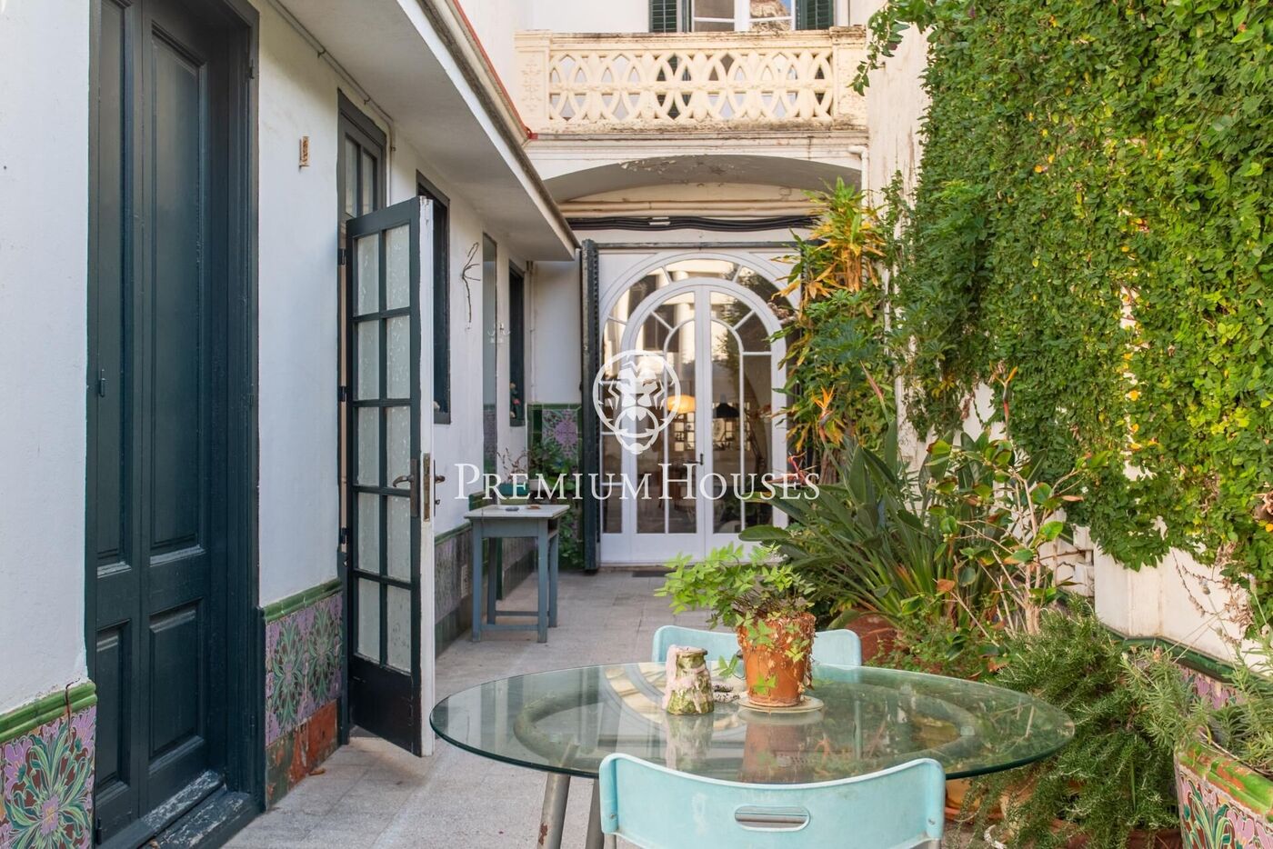 L'accés principal es fa a través del jardí, presidit per una elegant terrassa d'estiu amb balustrada de pedra. Des d'aquí s'accedeix a l'interior que dóna pas a un vestíbul refinat, on una espectacular vidriera original, dissenyada pel mateix arquitecte, anticipa la noblesa i la singularitat de l'habitatge.