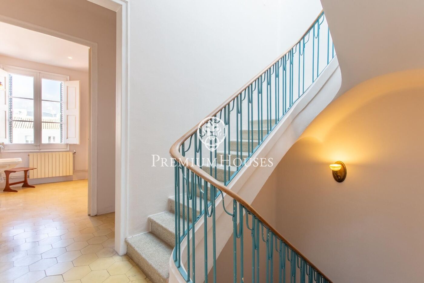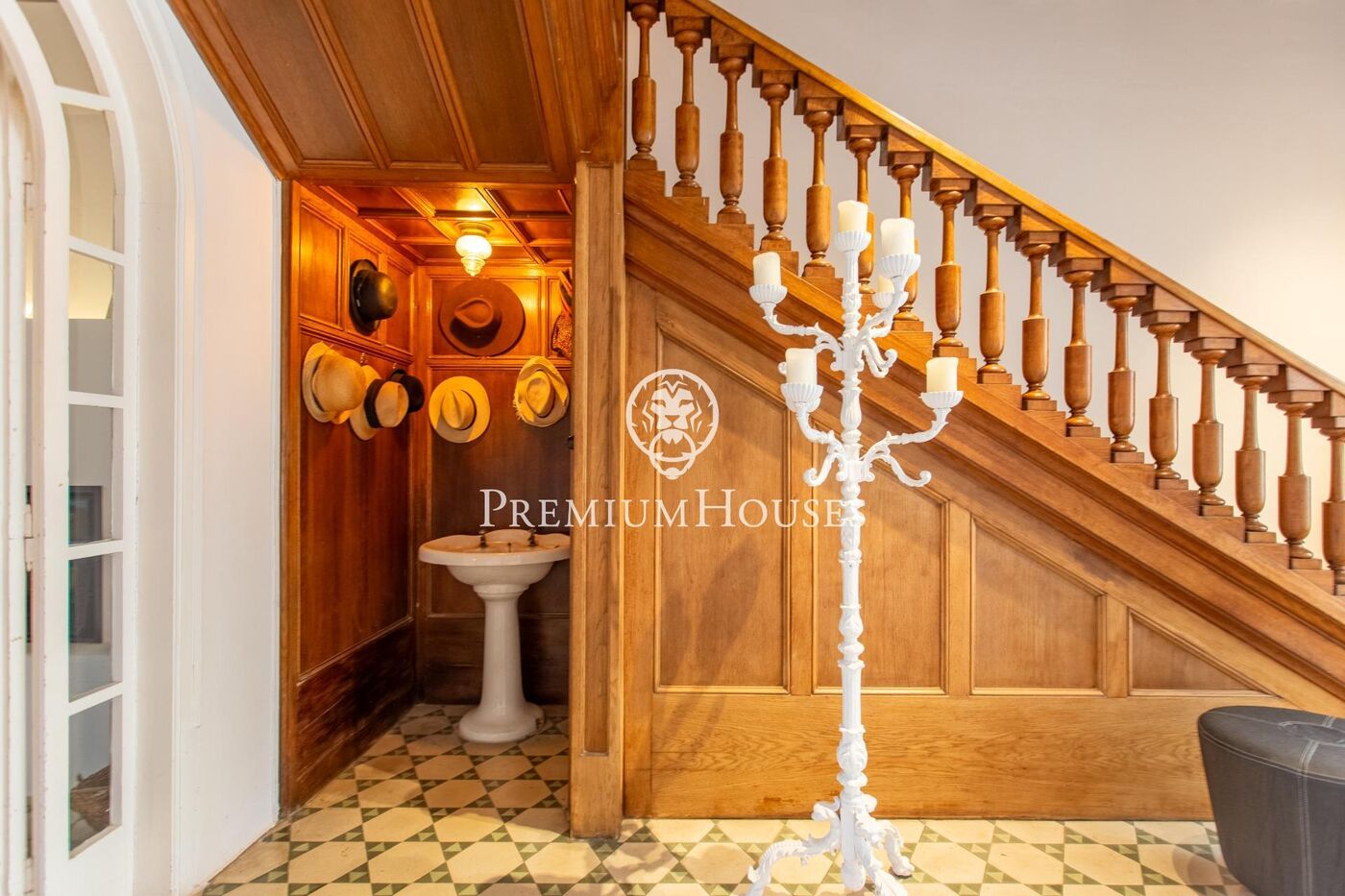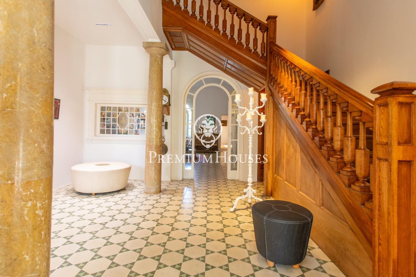 El rebedor destaca per les columnes de marbre, els terres hidràulics originals i una majestuosa escala de fusta, autèntica peça central de la casa.