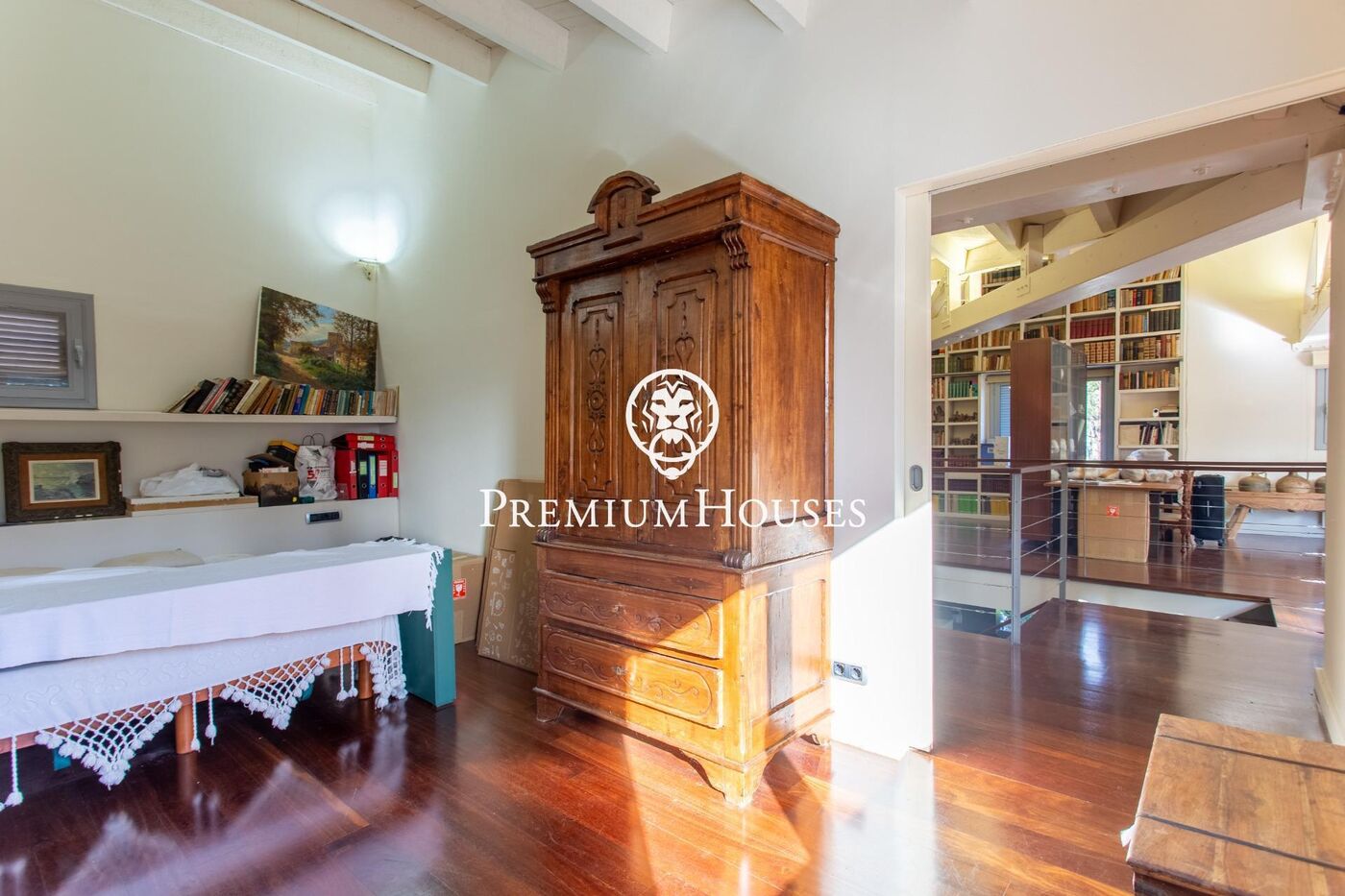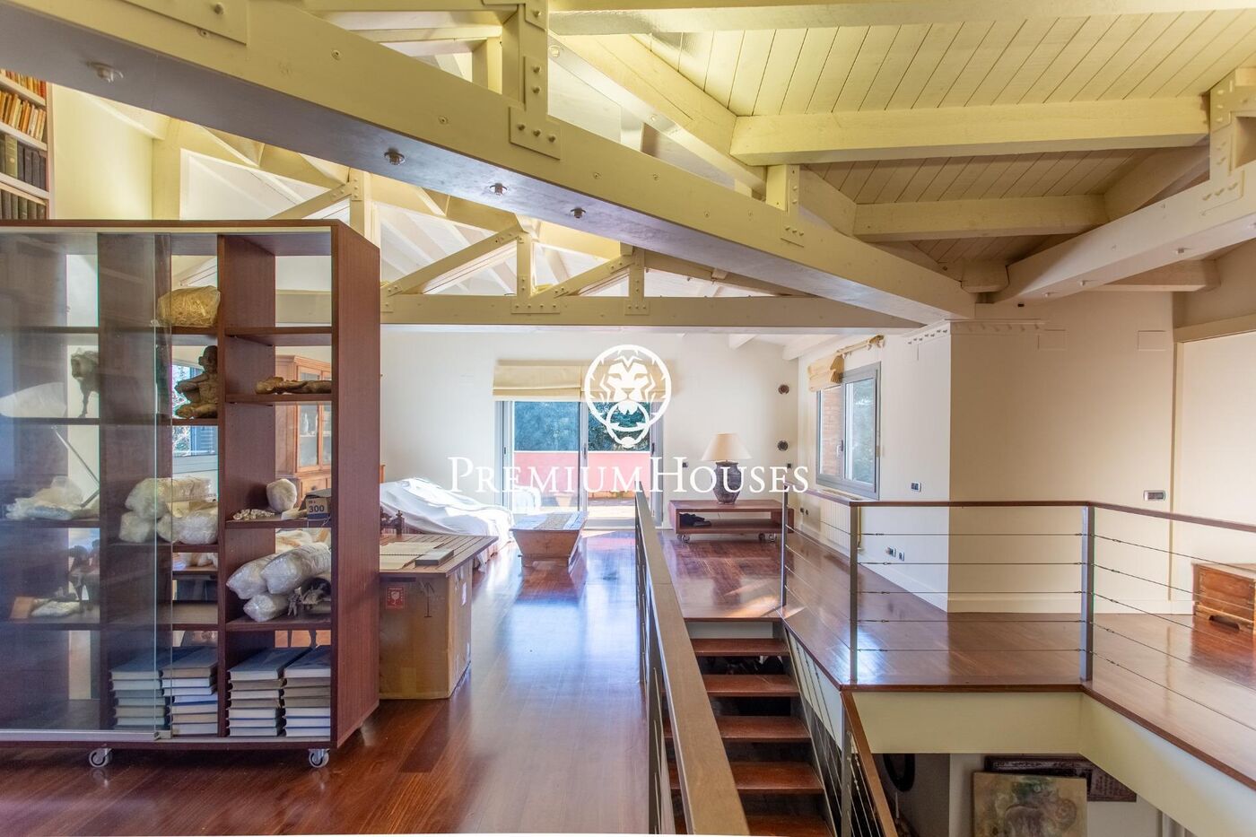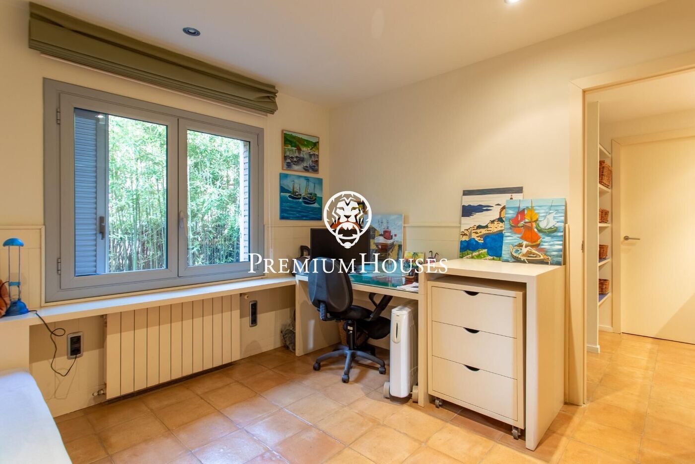 La planta superior es un pequeño tesoro: un espacio polivalente con alma de estudio, lleno de encanto gracias a las vigas vistas, y con salida a una gran terraza con vistas al jardín y la piscina. En esta misma planta se suma otra suite, perfecta para huéspedes o para quien busque independencia.