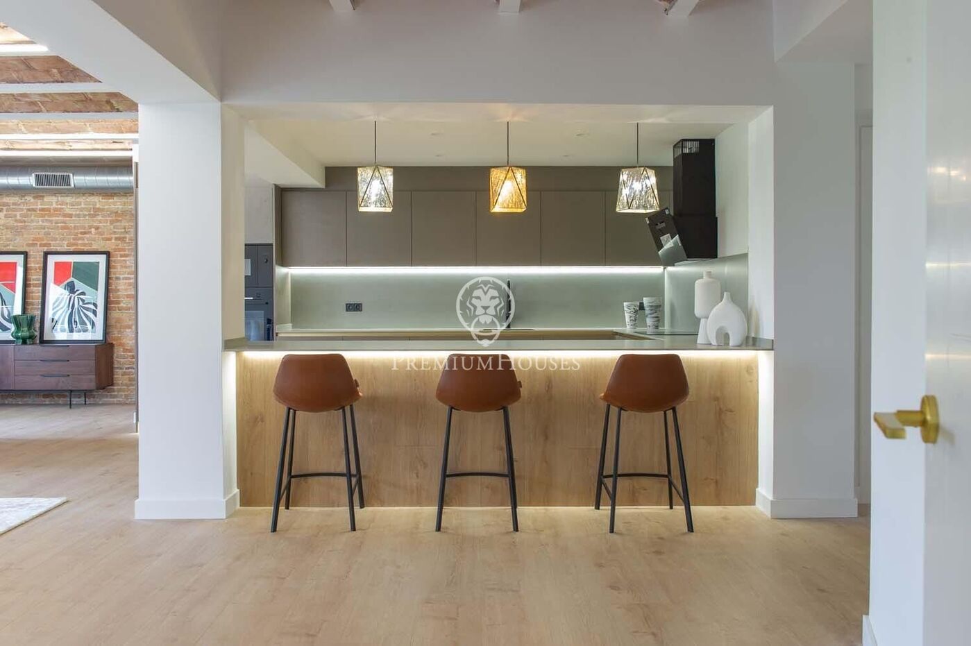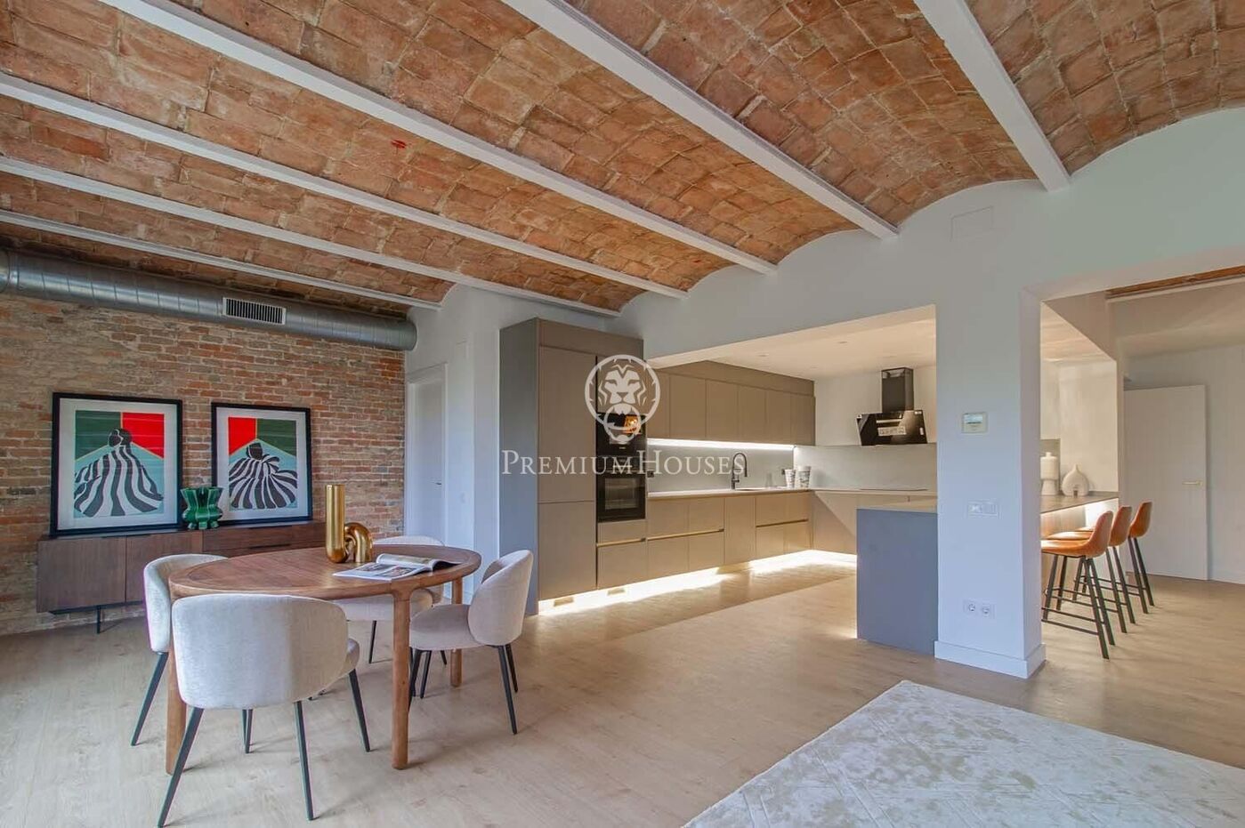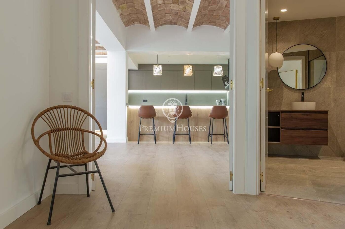 The day area features a spacious living-dining room with traditional Catalan vaulted ceilings and a fully fitted kitchen with a central island and integrated appliances. The kitchen connects seamlessly with the living space, creating a sense of openness and comfort. Additionally, the flat includes a generous entrance hall and a separate, practical laundry area.