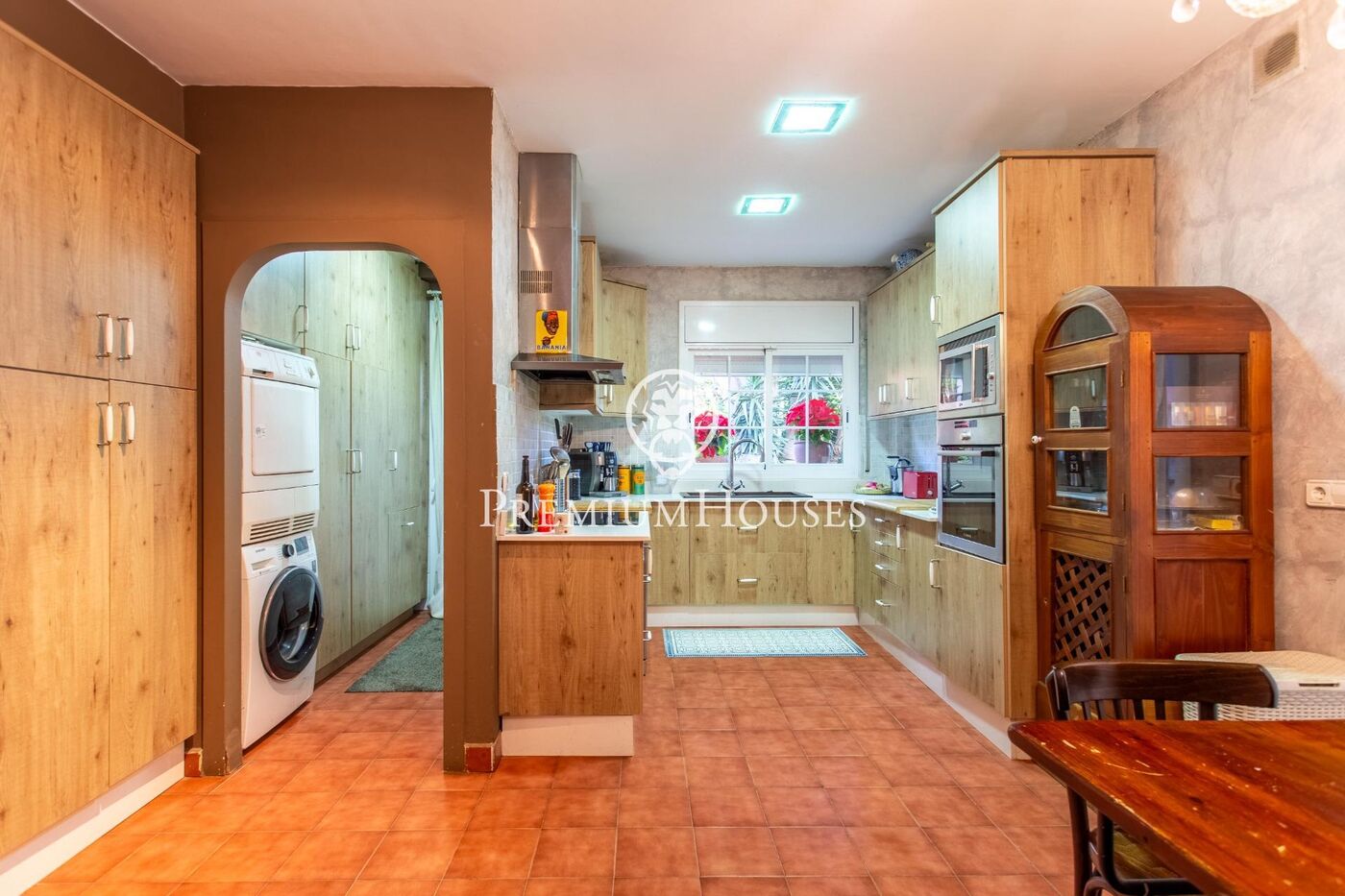 On the other side of the hall, we have the kitchen, spacious, with plenty of furniture for storage and a dining area. It has a space next to it as a laundry room, from which we have access to the garden. To complete the floor, we have a room and a courtesy toilet.