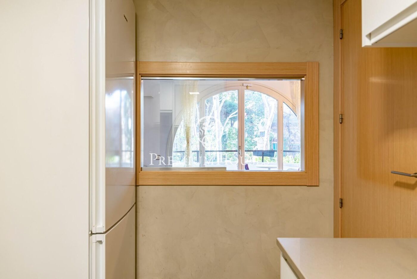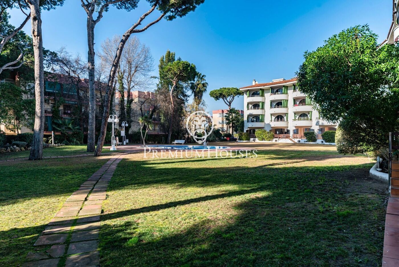 The apartment is distributed as follows: a living-dining room with access to a terrace overlooking the garden and pool. Adjacent to this is a separate kitchen with access to a utility room and laundry area.