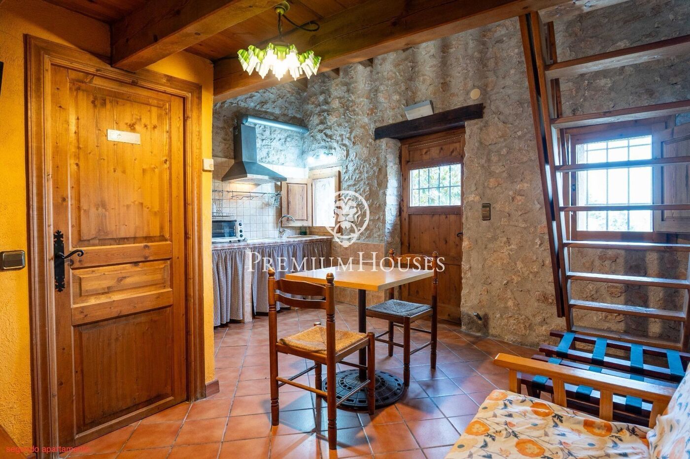 The second apartment is a studio with a living room-kitchen-dining room, a full bathroom, and a loft with a double bed.