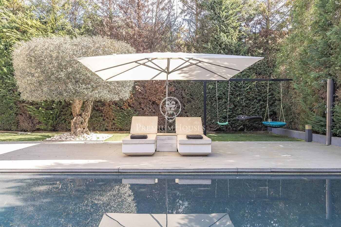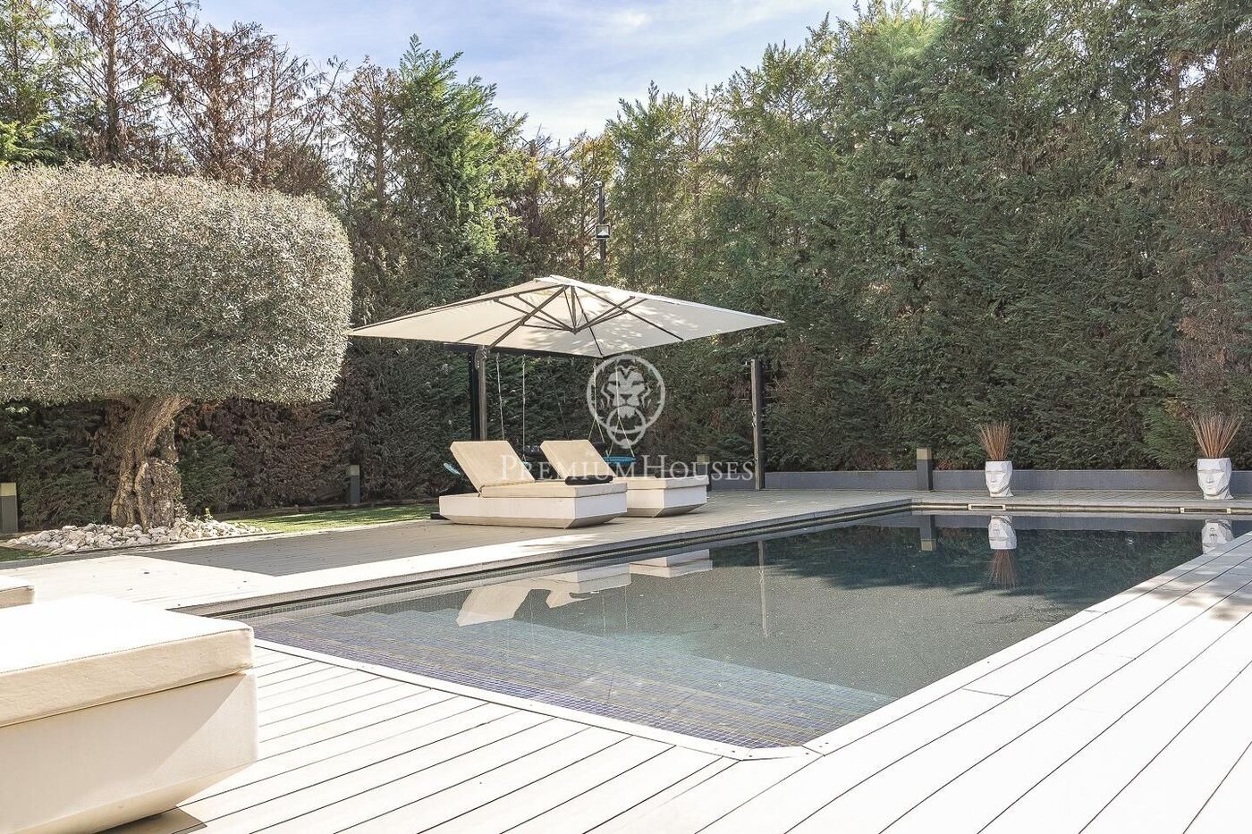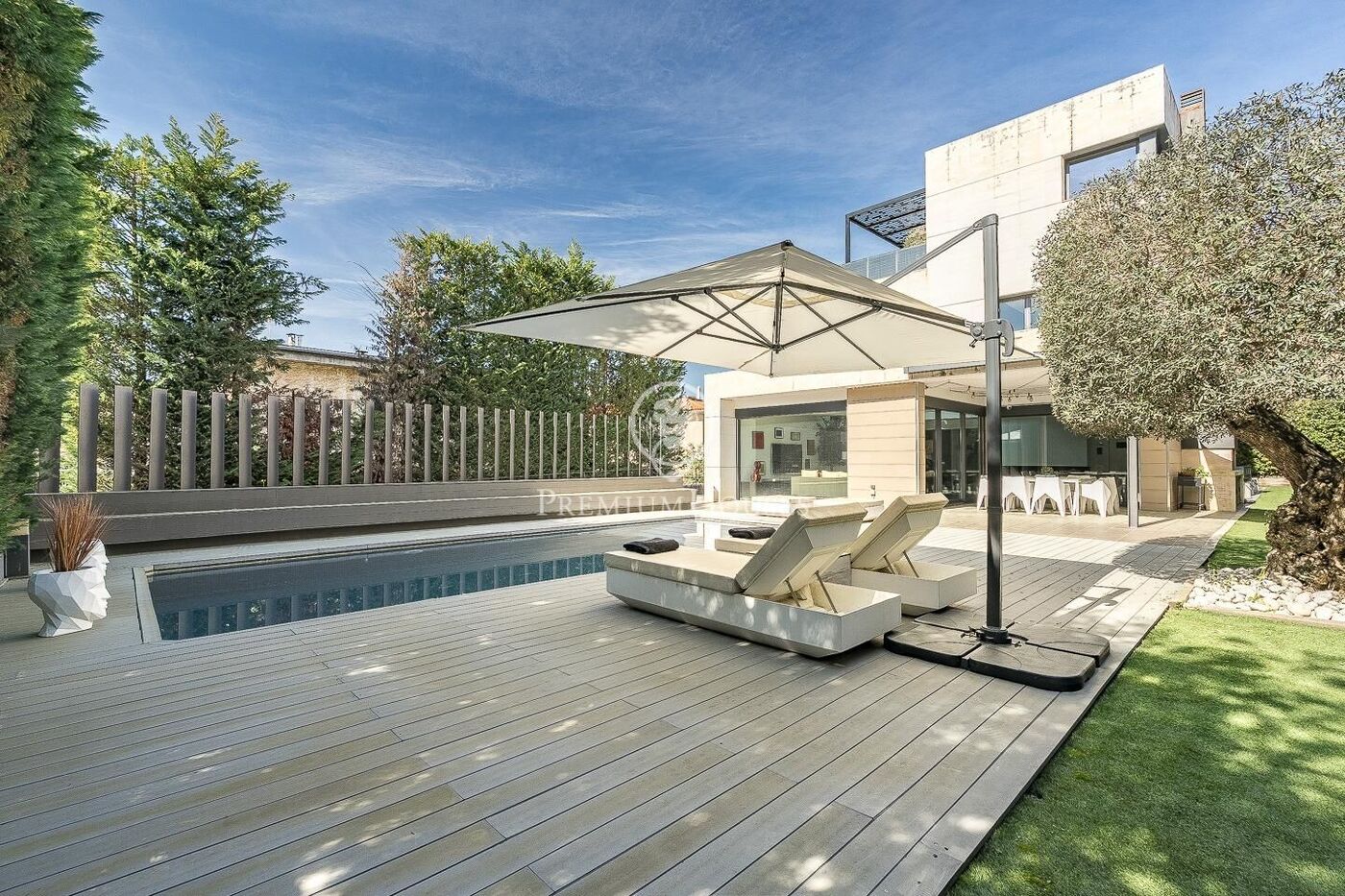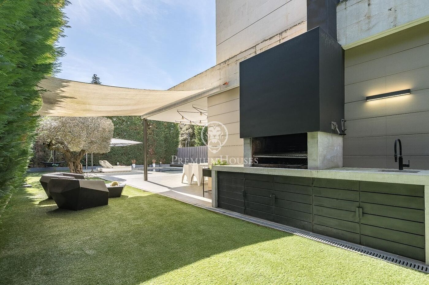 The outdoor space has been meticulously designed, highlighted by a dark-tiled pool that adds a sophisticated touch, surrounded by artificial grass, sunbathing areas, and various chill-out spots to enjoy the Mediterranean climate. Regarding technical features, the house includes parking for four vehicles, a gym or multipurpose room, a laundry room, and an advanced security system. The property also boasts underfloor heating, ducted air conditioning, and LED lighting.