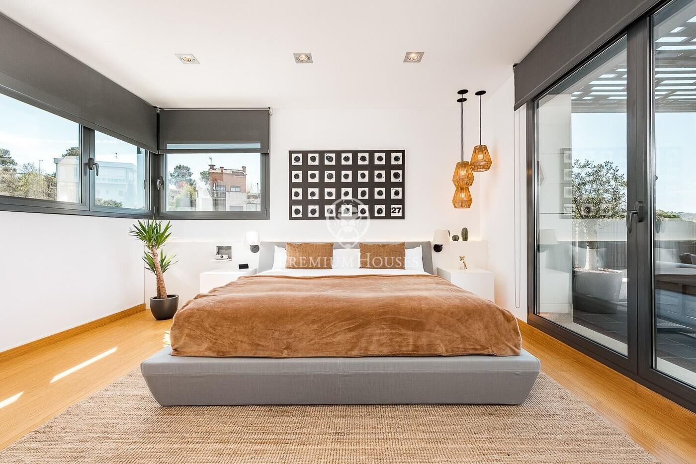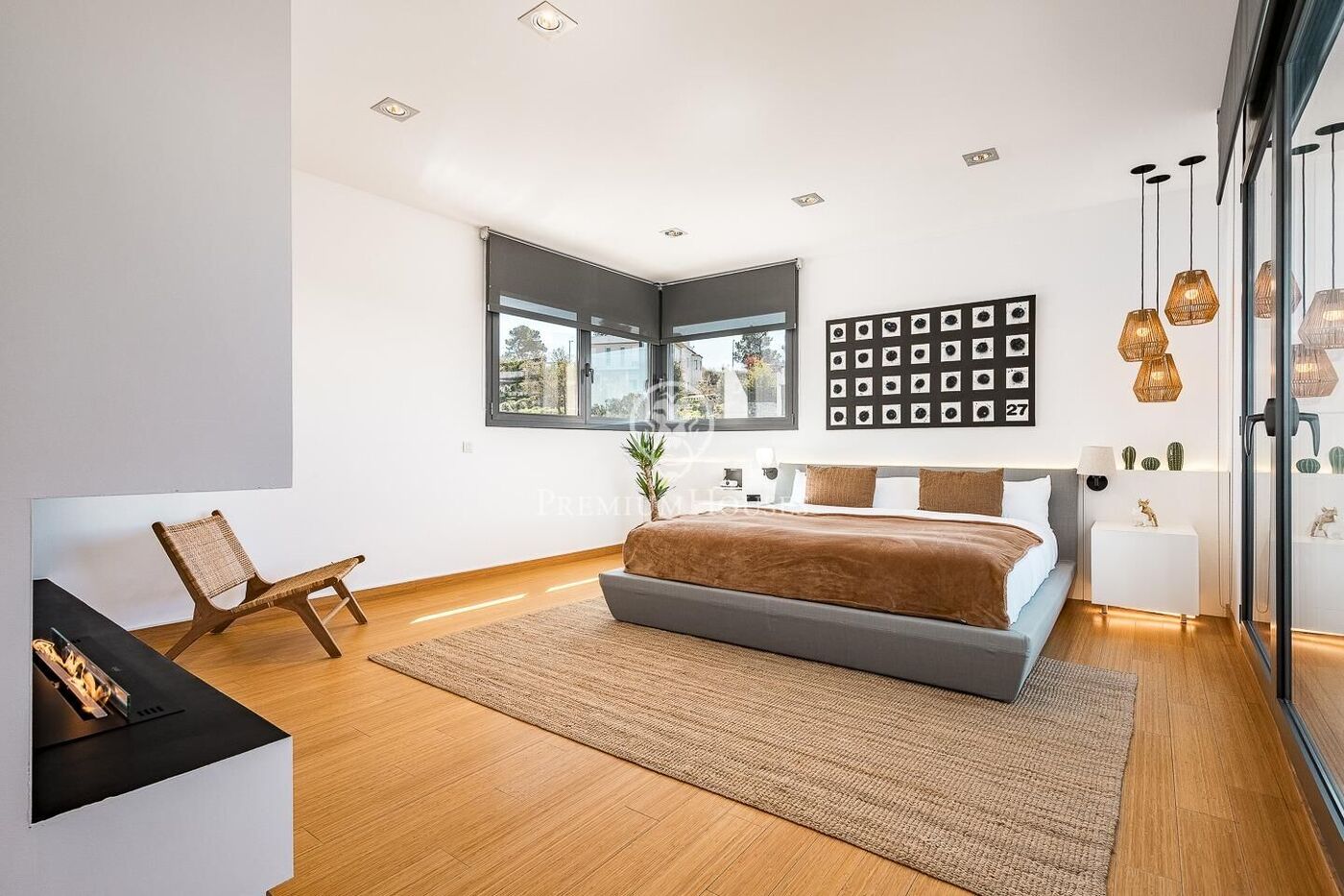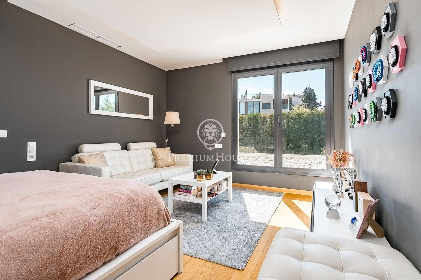 The outdoor space has been meticulously designed, highlighted by a dark-tiled pool that adds a sophisticated touch, surrounded by artificial grass, sunbathing areas, and various chill-out spots to enjoy the Mediterranean climate. Regarding technical features, the house includes parking for four vehicles, a gym or multipurpose room, a laundry room, and an advanced security system. The property also boasts underfloor heating, ducted air conditioning, and LED lighting.