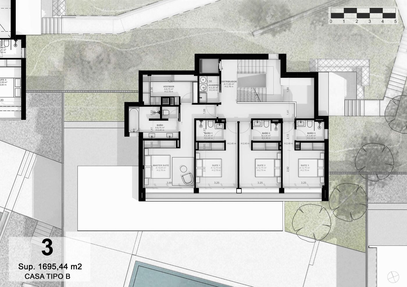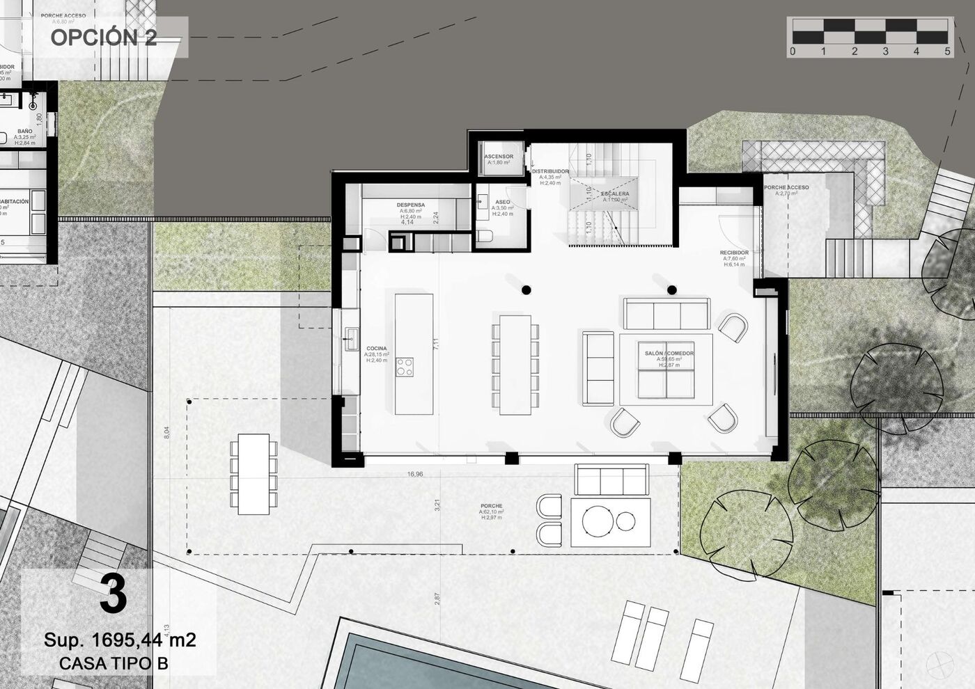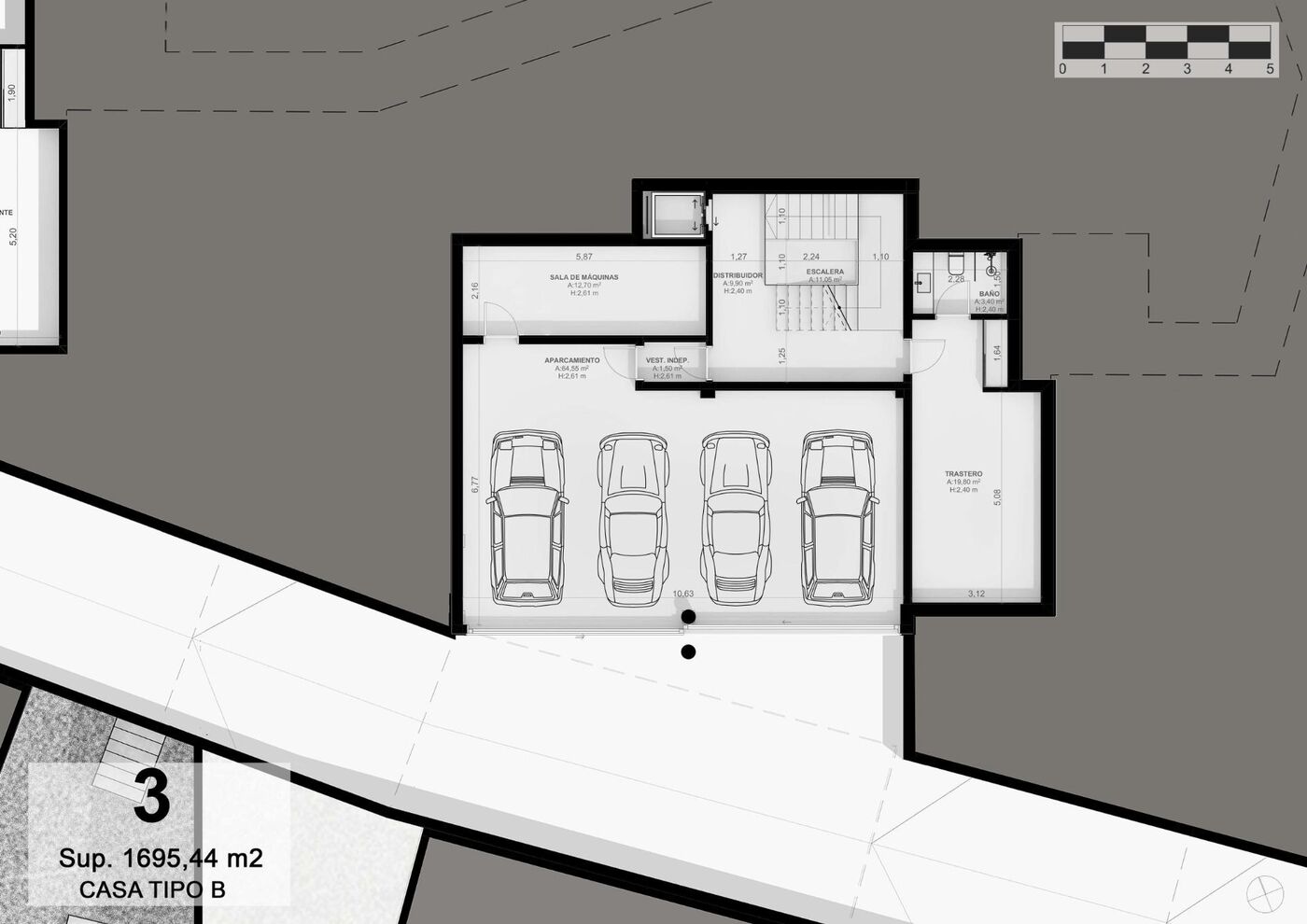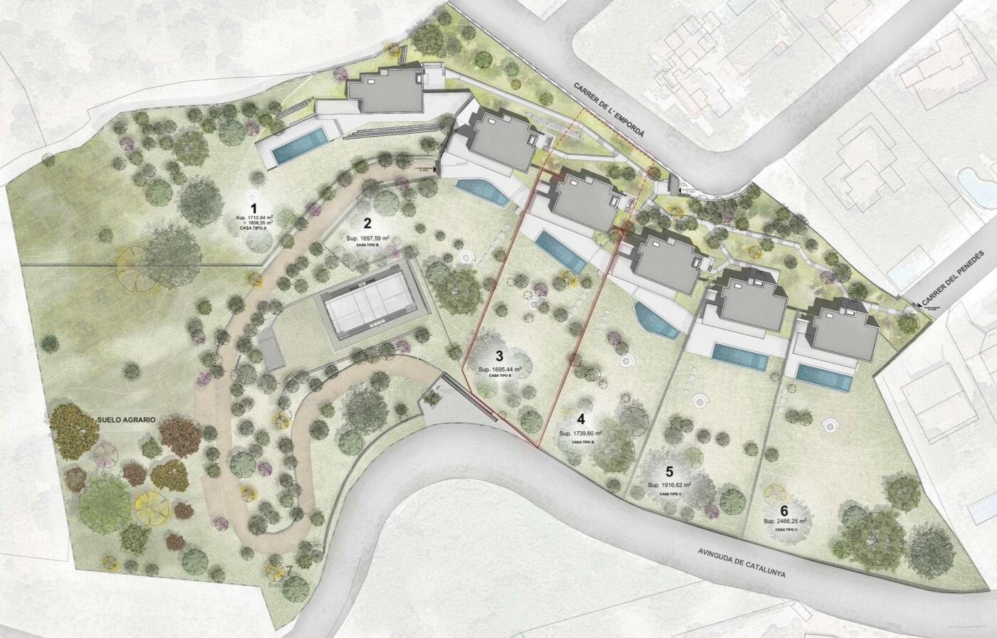 À l'entrée une agréable promenade au milieu d'arbres magnifiques et de végétation méditerranéenne à faible entretien nous conduit directement à une rue souterraine qui donne accès aux garages privés d'une capacité de quatre voitures pour chacune des propriétés.