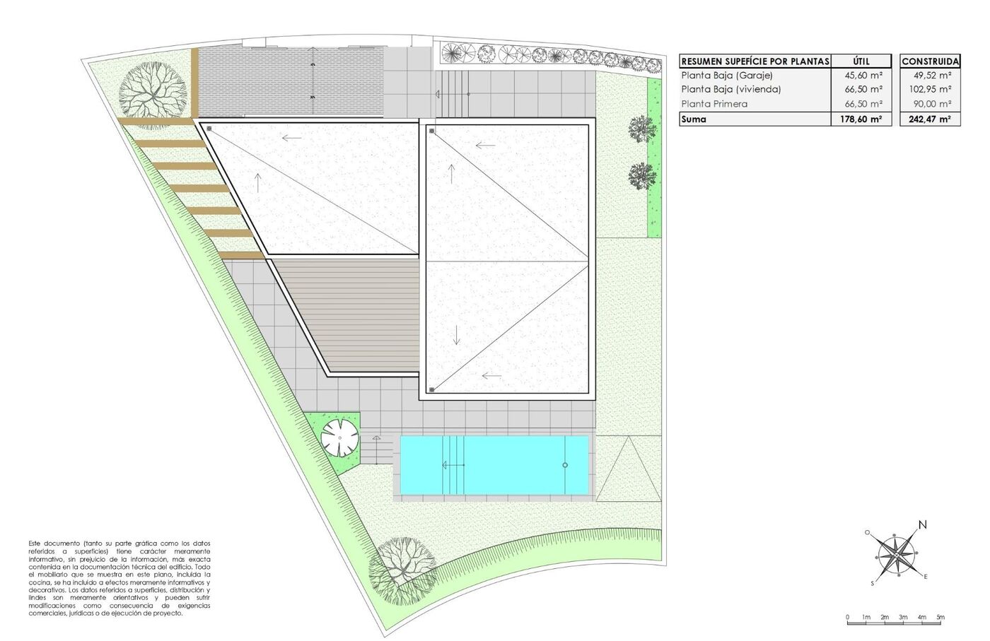 La planta principal se caracteriza por su amplio salón-comedor bañado en luz natural, gracias a grandes ventanales que se abren al jardín privado. Este espacio exterior está meticulosamente diseñado e incluye una piscina rodeada de vegetación, perfecta para disfrutar del clima mediterráneo. La cocina, abierta al salón-comedor, combina estética y funcionalidad, convirtiéndose en el corazón del hogar. Esta planta también cuenta con un lavadero, un baño completo y una habitación doble. Desde aquí se accede directamente a un garaje con capacidad para dos coches y espacio adicional para motos.