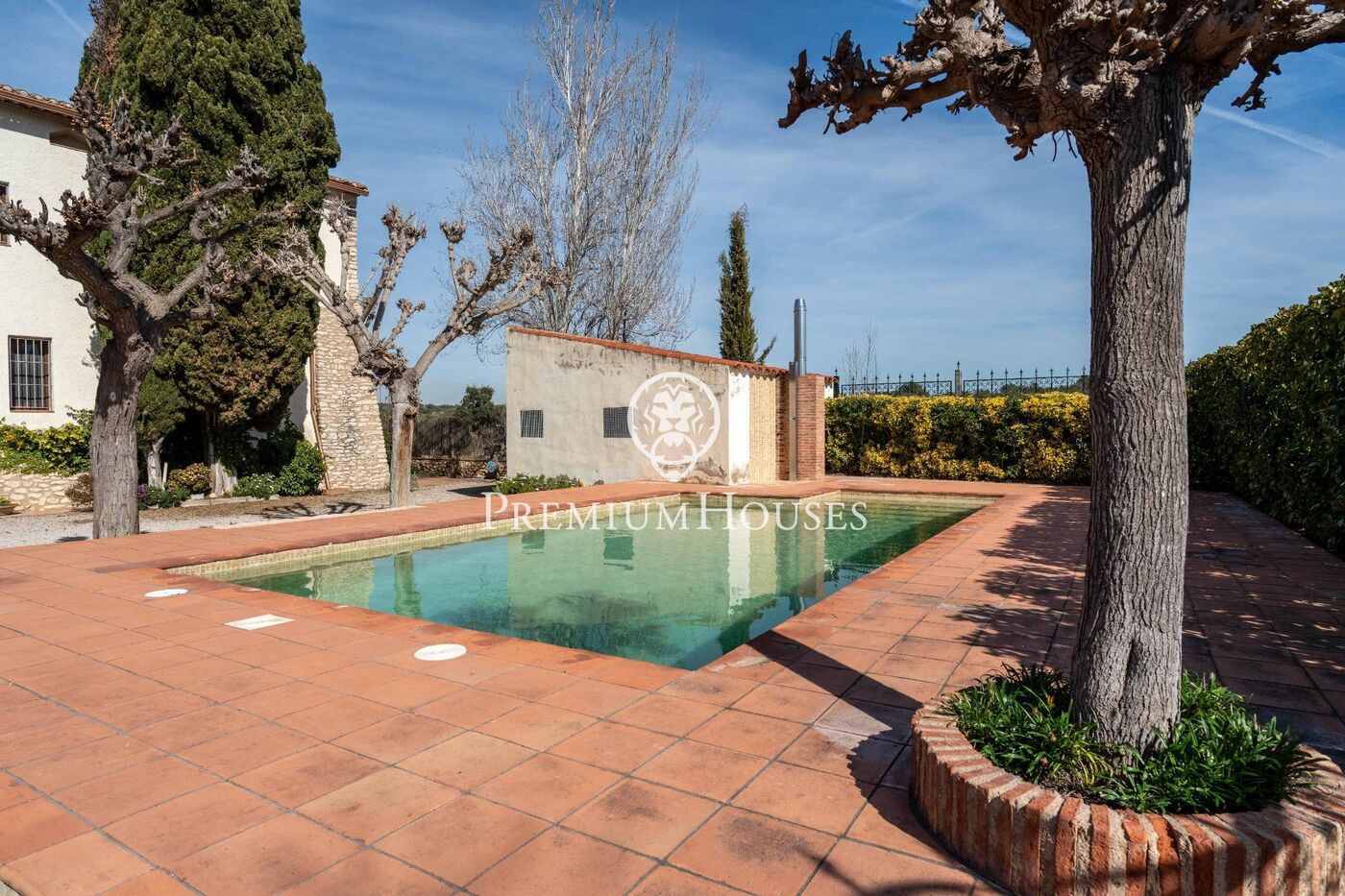 На территории усадьбы также есть погреб и, рядом с бассейном, вспомогательное здание, предназначенное для машинного зала и хранения.