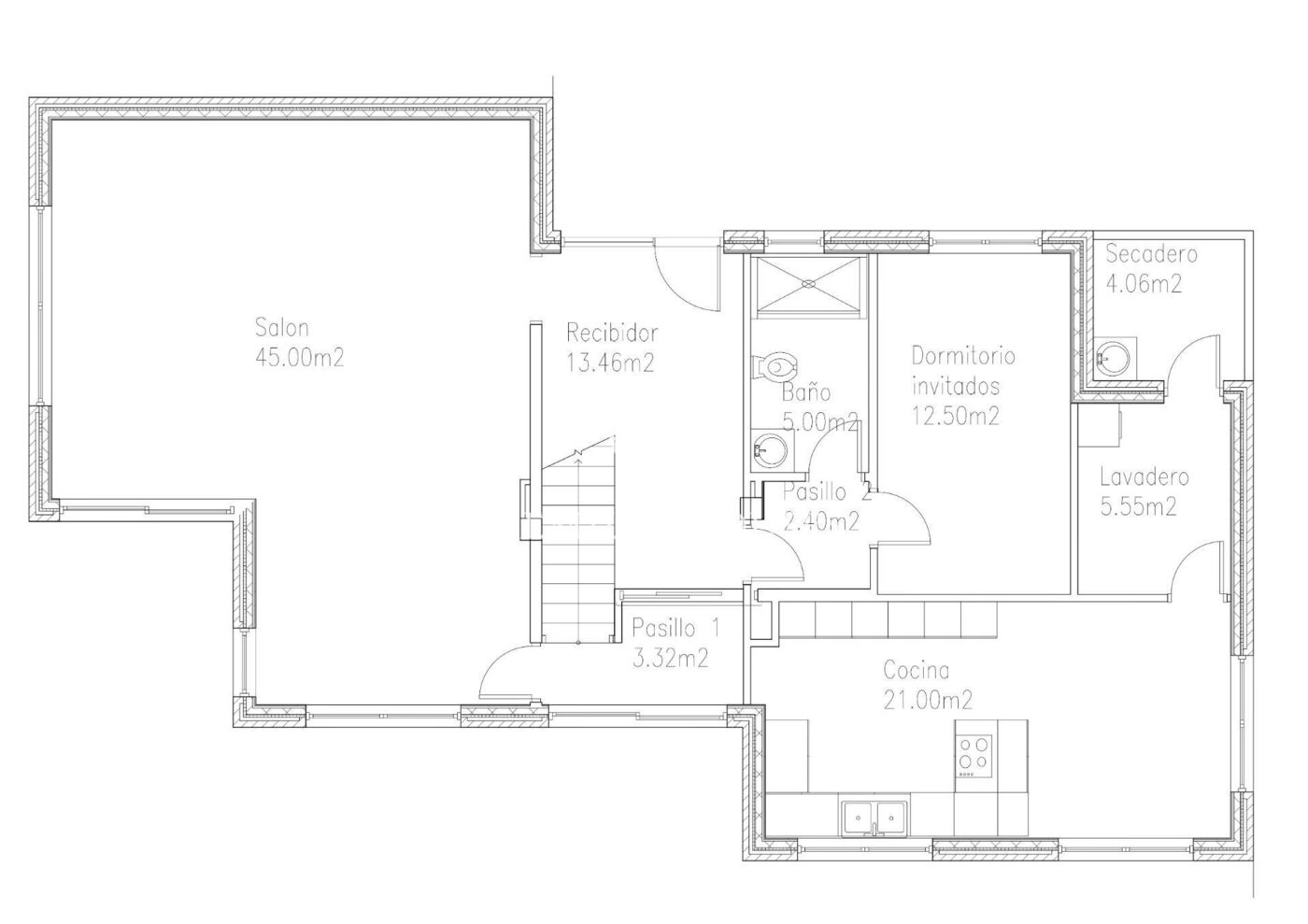 На основном этаже находятся холл с высоким потолком, просторная гостиная с выходом в сад, кухня с островом в офисном стиле, прачечная и спальня с ванной комнатой.