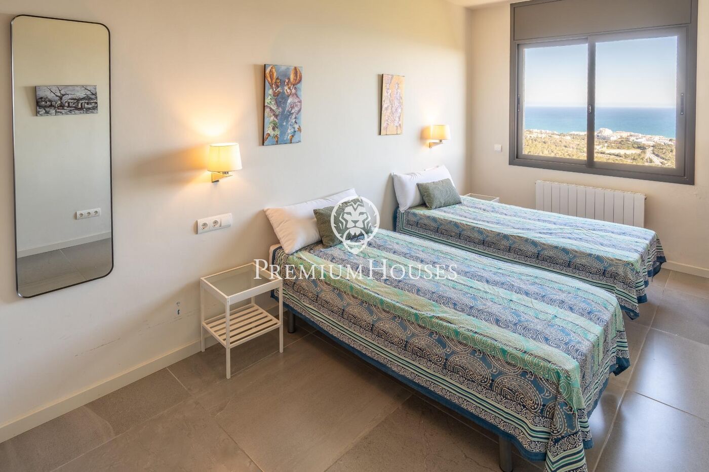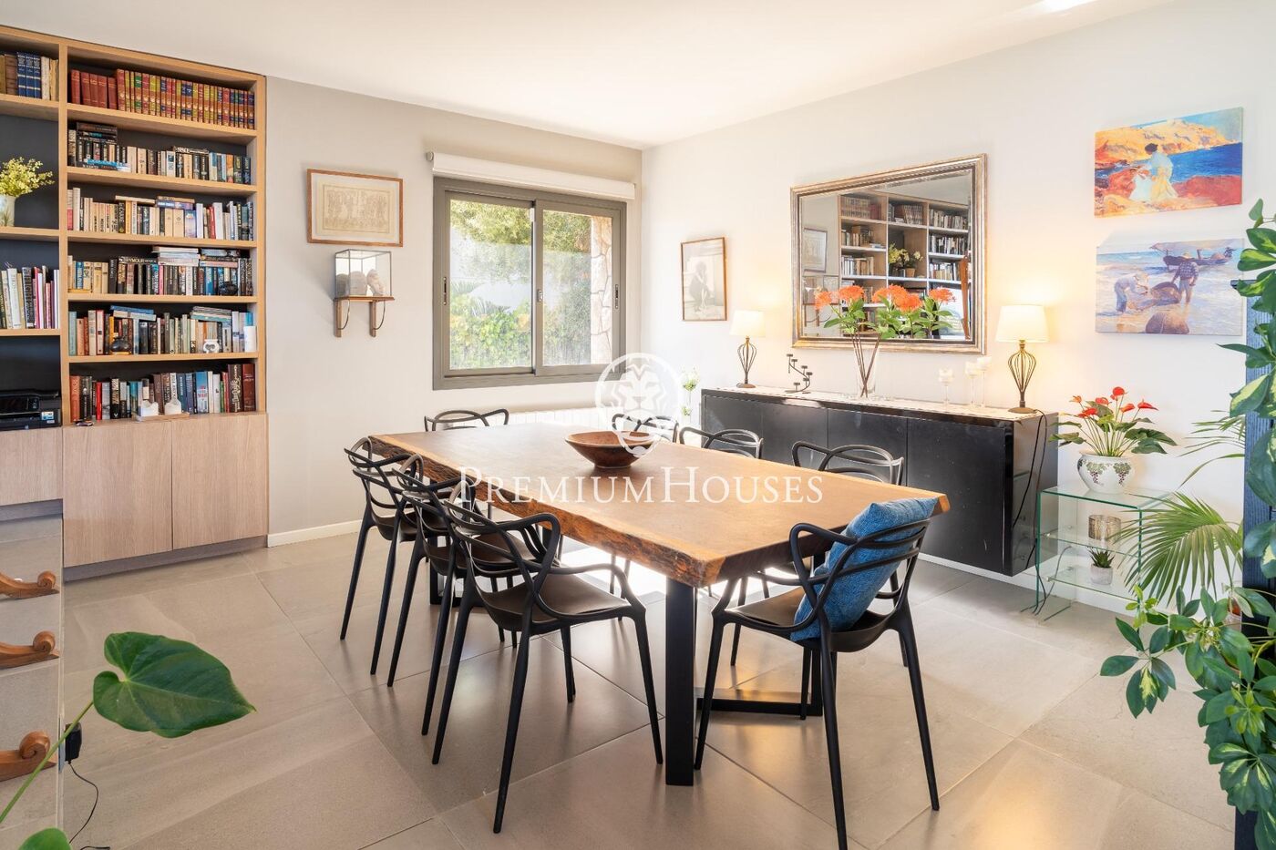 Мы попадаем в дом через большой сад с бассейном. Из этой зоны мы попадаем на первый этаж дома, где находим кухню с центральным островом, гостиную-столовую и гостевой туалет. Кухня и гостиная имеют прямой выход во второй сад с захватывающим видом на море и Ситжес. Это открытая площадка с мексиканским патио, гидромассажной ванной и верандой.