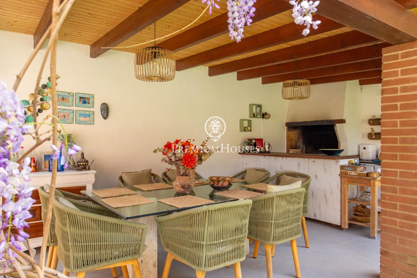 Accedemos a la vivienda a través de un bonito chillout con vistas despejadas, este nos da acceso a la zona de día donde encontramos un recibidor, aseo de cortesía, amplio salón comedor con bonita chimenea con salida al jardín y piscina, cocina independiente con despensa y sala de lavado.