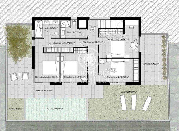 La zona de noche en la planta baja esta compuesta por una habitación en suite con vestidor y tres habitaciones dobles con un baño compartido. Todas las habitaciones tienen acceso directo al jardín. Dicho jardín cuenta con una piscina de gran tamaño.